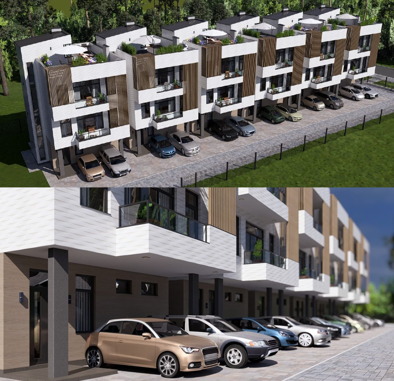Секция с 4мя спальнями и 4мя санузлами, эксплуатируемой крышей, навесом с паркингом для двух автомобилей. Адаптируем проект под ваши пожелания.